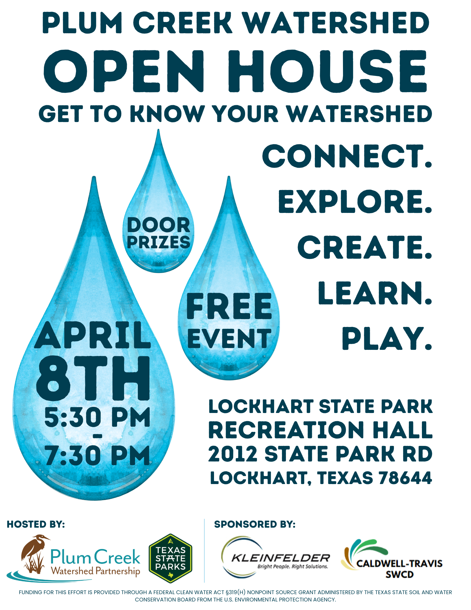 The Plum Creek Watershed Partnership invites the community to learn more about the watershed and connect with local organizations during the Plum Creek Watershed Open House. This community-wide, family-friendly event will take place on Wednesday, April 8, 2026, from 5:30 PM to 7:30 PM at the Lockhart State Park Recreation Hall, located at 2012 State Park Rd., Lockhart, Texas 78155.